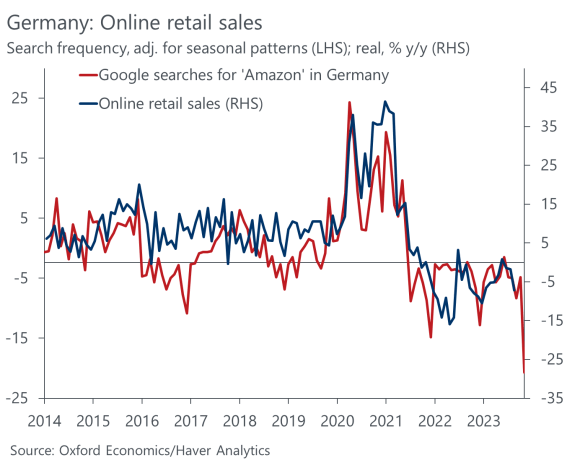 In tal senso, ci viene incontro questo altro grafico, il quale compara le ricerche su Google relative ad Amazon in Germania con il dato delle vendite on-line. Se dovesse essere re-couple al ribasso, stante la quota di mercato che l’e-commerce ha ormai conquistato e consolidato col Covid e ai prezzi da monopolio, il Natale dei tedeschi sarà magro. Molto magro.