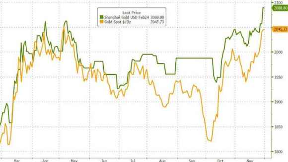 Ma non basta. Date un’occhiata a quest’altro grafico, alla luce delle valutazioni dell’oro letteralmente esplose tra domenica e lunedì e salite fino al record assoluto di 2.140 dollari l’oncia: mostra la correlazione fra prezzo dell’oro in Asia (Shanghai USD) e quello spot e di carta occidentale, fra Comex e Cme.
