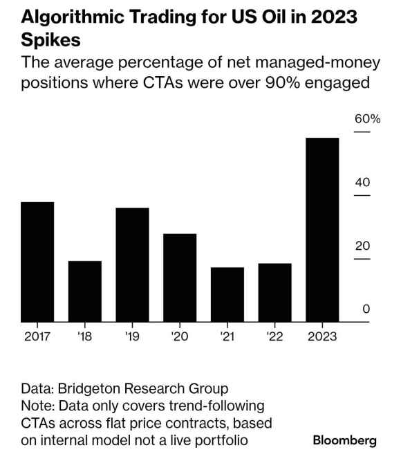 I numeri offerti dallo studio di TD Bank e JP Morgan sono da shock. I CTA – ovvero gli algoritmi degli hedge funds – sono di fatto responsabili per il 70% del trading quotidiano di petrolio. Pura speculazione. No delivery. Nessuno vuole i barili, mica sono linee aeree. O fabbriche. Seguono (e amplificano) i trend. A detta di Ilia Bouchouev, ex managing partner alla Pentathlon Investments e oggi docente alla New York University, «nessuno ha davvero percezione di quanto enormi siano le loro posizioni. Probabilmente, molto più grandi di BP, Shell e Koch. Messe insieme».