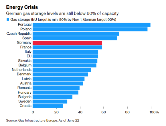 Ma non si doveva parlare di tetto sul prezzo dell’energia, prioritario per l’Europa? Lo si è fatto. E, come nella migliore tradizione, i convenuti hanno deciso che ci rifletteranno. Tradotto, il business fruttuoso dei futures sulle materie prime energetiche non si tocca. E qui non è stata l’Olanda a porre il veto, bensì pressoché tutti tranne l’Italia. La quale, come mostra questo grafico è ben al di sotto della metà del guado, in quanto a riempimento delle riserve di gas entro il 1 novembre.