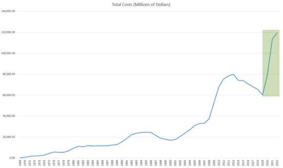 La grafica parla chiaro: nell’ultimo anno pre-pandemia, il 2019, quel programma costava al budget federale 60,3 miliardi di dollari. Oggi ne costa 119,5, dato relativo al 2022. Ma non basta. Nel medesimo arco temporale, il corrispettivo medio per percettore è passato da 129,83 dollari all’attuale 230,88 dollari. Un sobrio aumento del 78%. E ancora: sempre rispetto al 2019, il tasso di partecipazione a quel programma è passato da 35,7 milioni a 41,2 milioni di persone. Un dato che dimostra come – nonostante la fine dei lockdown, della crisi economica da Covid e l’ondata di retorica per la strabiliante ripresa dell’economia Usa basata sul libero mercato – l’esercito dei percettori cronici di sussidi federali in America non sia affatto calato nei numeri.