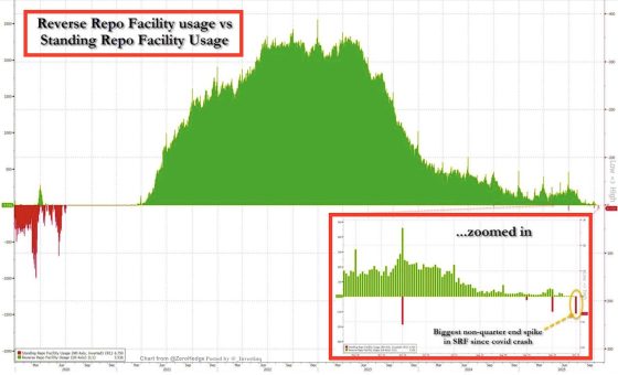 Prima, 6,75 miliardi forniti dalla Standing Repo Facility, un qualcosa di assolutamente inusuale al di fuori dei giorni di fine mese e fine trimestre. In quei momenti, infatti, le banche chiedono denaro a breve termine per il cosiddetto window dressing, l’abbellimento dei bilanci. Tutti lo fanno, tutti lo sanno. Assolutamente manipolatorio. Ma assolutamente innocuo.