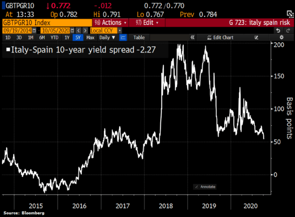 Insomma, cosa ci dicono queste cifre? Nulla di buono. Paradossalmente, leggendo i giornali di ieri la percezione appariva contraria, stante la discesa senza precedenti del rendimento del nostro decennale. Ed ecco, infatti, che questo altro grafico mostra il trend di re-couple dei nostri Btp rispetto ai Bonos spagnoli pari durata: lunedì 5 ottobre, il differenziale fra i due titoli ha toccato il livello minimo dal 2018, “solo” 54 punti base.