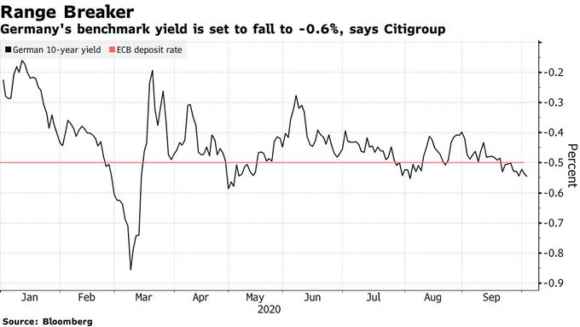 Il terzo punto critico e da tenere in considerazione per le settimane a venire fa riferimento a quanto rappresentato in questo ultimo grafico, il quale mostra come un eventuale aumento degli acquisti obbligazionari da parte delle Bce in combinato con le minori emissioni previste dal Tesoro tedesco e l’aumento della richiesta di beni rifugio in caso di acutizzazione della seconda ondata di pandemia in Europa, potrebbe spedire il rendimento del Bund a 10 anni al -0,6% da qui a fine anno.