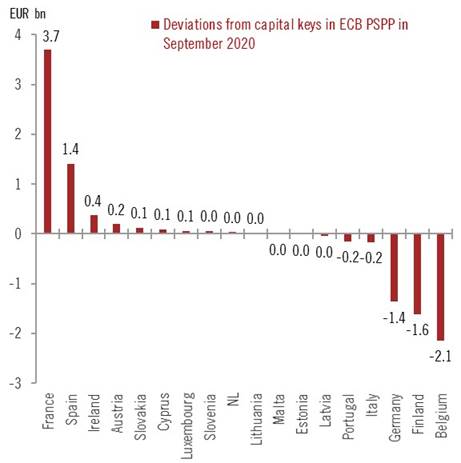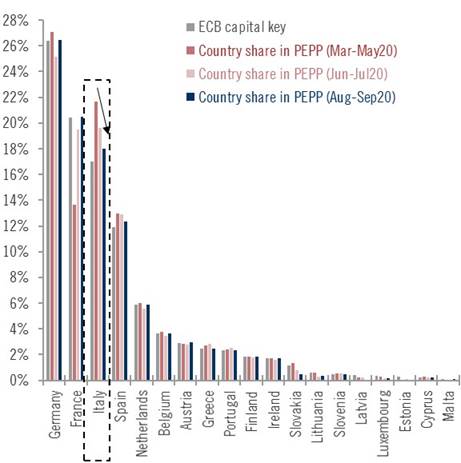 Il secondo grafico invece mostra la dinamica relativa solo al mese di settembre a livello di deviazione generale e, come noterete, i principali beneficiari sono stati anche i Paesi maggiormente colpiti dalla seconda ondata di pandemia, ovvero Francia e Spagna. Quest’ultima, fra agosto e settembre, ha visto la Banca centrale acquistare suoi Bonos per 18,7 miliardi di controvalore.