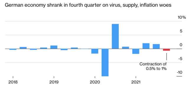 Piccolo particolare, la OOH non è conteggiata nel computo dell’HICP, l’indice generale. Il quale, quindi, sarebbe in realtà ben più alto dei 5% ufficiale. Berlino ora fa sul serio, perché tutto può permettersi tranne che una bolla immobiliare a rischio scoppio a fronte di quanto mostrato da questo altro grafico: nei mesi finali dello scorso anno, il Pil tedesco è sceso dell’1% e spinto l’economia verso la seconda recessione in era pandemica a causa del combinato fra Omicron e crisi della supply chain.