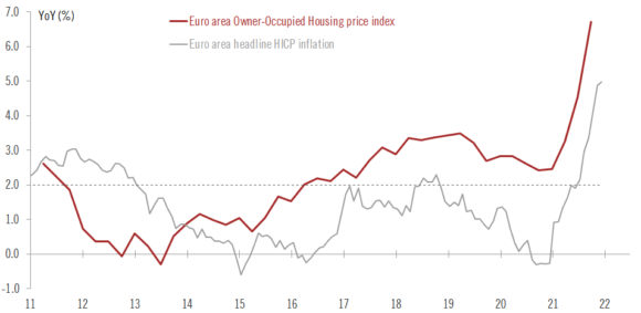 La ragione? La mostrano chiaramente questi due grafici, ultimo allarme scattato in casa Bundesbank e preso atto del quale Nagel avrebbe operato in modalità Big Ben di Portobello: ha detto stop. A fronte di un indice tedesco dei prezzi degli immobili alle stelle e cresciuto in perfetto tandem con l’aumento del bilancio Bce per gli acquisti legati ai vari programmi di Qe, ecco che la seconda immagine mostra come l’inflazione immobiliare OOH (Owner-Occupied Housing, le case occupate dai proprietari) dell’Eurozona nel terzo trimestre del 2021 sia salita al livello di record assoluto del 6,7% su base annua, sancendo crescite fuori controllo sia degli affitti (+1,2%) che dei prezzi di vendita (+9,2%).