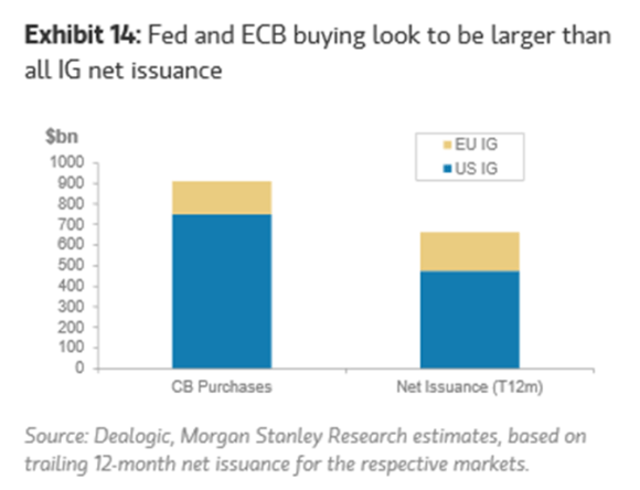 Come vedete, il dinamico duo composto dalle Banche centrali statunitense ed europea sta comprando obbligazioni investment grade per un controvalore che, anche in questo caso, è superiore alle emissioni nette. Signore e signori, benvenuti nel capitalismo dell’anno 2020! La pianificazione totale, l’orgia della contabilità creativa che diviene strategia di investimento: ormai i dati macro non contano più nulla. Puoi avere debiti infiniti e cash-flow pari a zero, ma se riesci a infilarti in qualche modo nella platea di collaterale accettato dalle Banche centrali, sei salvo. A prescindere. Da tutto.