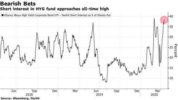 E cosa ci mostra questo grafico? Che, nonostante il mantra per restare in vita sul mercato sia ormai Don’t fight the Fed, le posizioni ribassiste sull’Etf che traccia i principali junk bonds hanno appena toccato un livello molto prossimo al loro massimo storico: 38% dei titoli in outstanding, a un passo dal 39% sfondato lo scorso febbraio (prima cioè che la Fed sfoderasse il bazooka totale). Il tutto, proprio mentre la Federal Reserve ha messo in campo il suo backstop del mercato più grande di sempre, una sorta di firewall inattaccabile.
