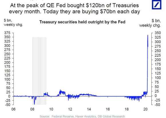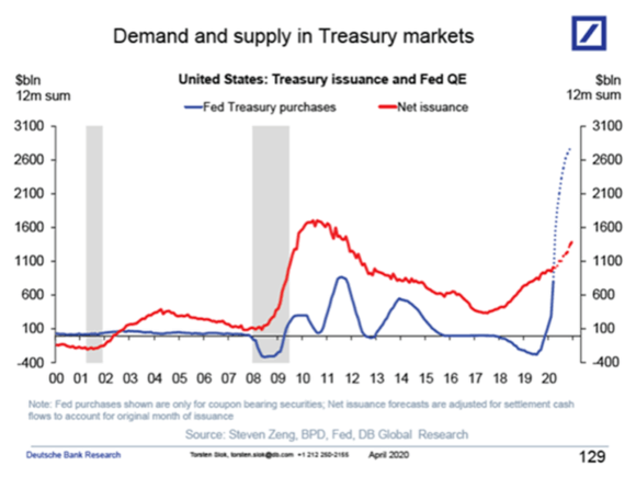 Il secondo grafico, però, è ciò che maggiormente ci interessa, perché rappresenta la trasposizione in realtà del sogno proibito degli economisti di riferimento della prima forza di opposizione del Paese. Al ritmo di intervento attuale, il quale appare difficilmente passibile di una seria forma di tapering a breve (stante il crollo immediato di Wall Street), la Fed comprerà di fatto un nozionale pari al doppio di tutte le emissioni di titoli di Stato del Tesoro Usa. Problema di deficit spending risolto! Si emette come dei pazzi, tanto la Fed compra non solo tutto, ma addirittura potenzialmente il doppio del programmato!