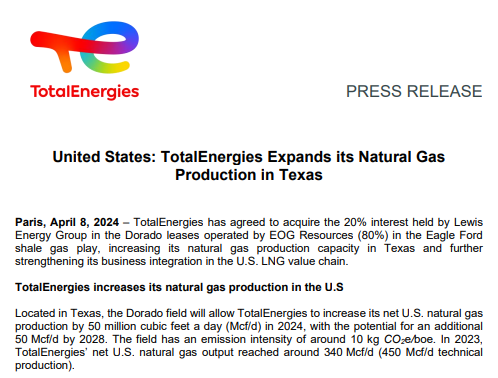 E in effetti, tanta dedizione ha pagato. E paga. Ciò che infatti viene ancora meno reso noto in Italia, nonostante la Francia sia pianeta a noi molto più vicino dell’onnipresente America, è il fatto che l’8 aprile scorso TotalEnergies abbia comunicato ufficialmente quanto segue: l’aumento tramite un’acquisizione strategica della presenza sul mercato Lng statunitense, garantendosi il 20% mancante alla totalità di controllo dello shale gas play Eagle Ford in Texas.