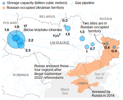 Nemmeno questo sapevate? La cartina mostra la mappa degli hub di stoccaggio dell’Ucraina, fra cui spicca quello di Bilche-Volytsko-Uherske, quasi al confine con la Polonia. Solo 60 chilometri. Per capirci, l’hub tedesco più grande – quello di Rehden – ha una capacity massima di 4 bcm. Quello di Bilche-Volytsko-Uherske di 17 bcm.
