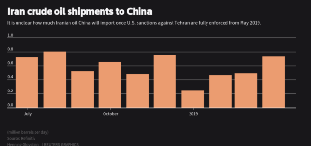 E stiamo parlando di un momento in cui, guarda caso, Washington ha tolto ufficialmente le esenzioni rispetto alle importazioni di petrolio iraniano per otto Stati, Italia compresa. La Cina ha ovviamente mostrato i muscoli, rispondendo con un salviniano “me ne frego”. Ma qualcosa, nella realtà, cozza. E non di poco. Se Pechino è così certa delle proprie mosse perché, come ci rende noto la Reuters, da mesi al largo del porto cinese di Dalian si trova una petroliera con a bordo 20 milioni di barili di greggio iraniano, controvalore di circa 1 miliardo di dollari e nessun azienda cinese si azzarda a scaricarlo? Non ne hanno bisogno, forse? Allora perché comprarlo? E una volta acquistato, perché tenerlo a mollo, in quella che in gergo tecnico viene definita modalità bonded storage? Eppure, questo grafico ci mostra come fino ad aprile compreso, Pechino abbia comprato greggio iraniano in modalità strutturale e sistemica: perché quei 20 milioni di barili ora restano al largo, proprio a ridosso della scadenza imposta dal Dipartimento di Stato?