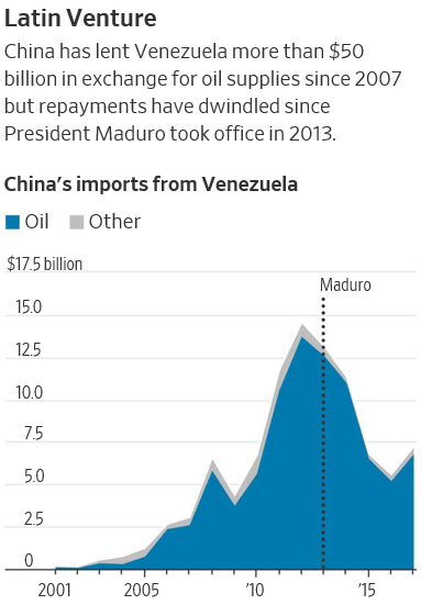 Avete notate, poi, il silenzio tombale della Cina? E signori, Pechino non ha di certo meno da perdere di Mosca nella disputa caraibica. Ce lo mostra questo grafico: se per caso Guaidó, Lopez o chi per loro dovessero davvero prendere il potere e mettere mano all’unica fonte di ricchezza del Paese, il petrolio, pensate che ripagare i debiti contratti con il Dragone – roba con qualche zero in coda – sarà la loro priorità?