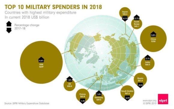 In compenso, appare istruttivo questo ultimo grafico, fresco di dati relativi all’intero 2018. Non solo, stando a elaborazioni dello Stockholm International Peace Research Institute (Sipri), l’anno scorso la spesa militare globale ha raggiunto il record di 1,82 triliardi di dollari, più 2,6% su base annua e il massimo dal 1988 (ovvero, da quando ancora c’erano la Guerra Fredda e il Muro di Berlino), ma proprio Pechino e Washington sono stati, guarda caso, i driver di quell’incremento di spesa.
