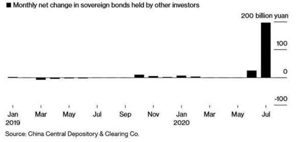 La Cina ha silenziosamente lanciato il suo Qe? La differenza storica fra le strategie di stimolo statunitense e cinese sta infatti nell’operatività: la Fed acquista assets dal mercato secondario, mentre la Pboc interviene attraverso tagli dei requisiti di riserva bancari che liberino implicitamente liquidità nel sistema. È un dato di fatto, noto a tutti. Questo grafico sembra però mostrare un recentissimo quanto drastico mutamento della dinamica: stando a dati tracciati dalla China Central Depository & Clearing Co. nel mese di luglio in Cina si è sostanziato un aumento degli acquisti di bond sovrani riconducibile alla voce “other investors”, la quale include Banche centrali e clearing house, come ad esempio Euroclear in Belgio. In totale si tratta di 196,5 miliardi di yuan di controvalore in più, i quali hanno portato il totale a 1,78 triliardi di yuan, circa 256 miliardi di dollari. In un solo mese.
