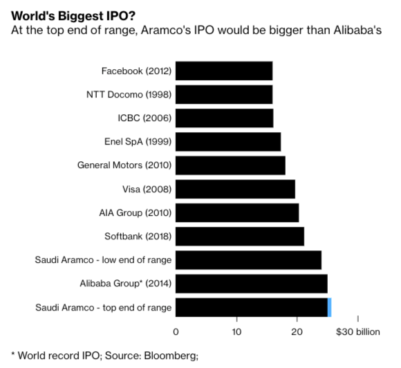 Cos’altro? In quasi perfetta contemporanea con le parole di Petraeus, la stessa Aramco si è vista costretta a rinunciare alle proprie pretese e a fissare il range di prezzo per l’Ipo fra 1,6 e 1,7 triliardi di dollari, ovvero al di sotto di quei 2 triliardi per settimane rivendicati come obiettivo non negoziabile dal principe Mohammed bin Salman in persona. E attenzione, perché c’è dell’altro. Primo, il range fissato dal 40% degli investitori professionali interpellati al riguardo da Bloomberg è infatti compreso fra 1,2 e 1,5 triliardi di dollari, quindi nella parte più bassa della forchetta rispetto a quella decisa da Ryad. Sintomo che dall’estero si sta tirando sul prezzo, negoziando in stile suk? Non proprio. Perché come mostra questo grafico, l’Ipo di Aramco rappresenta formalmente appunto il Sacro Graal di tutti i collocamenti, destinata sulla carta a stracciare anche il precedente record fissato dall’Ipo di Alibaba nel 2014 con i suoi oltre 25 miliardi di raccolta pubblica.