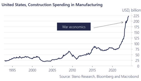 E sapete perché? Guardate questo grafico si chiama economia di guerra e permette alle spese per costruzioni negli Usa di esplodere letteralmente. Nel pieno di una crisi bancaria che dura da un anno e che al centro ha proprio l’esposizione al settore del real estate, mentre i tassi per contrarre mutui immobiliari sono ancora ai massimi da anni!