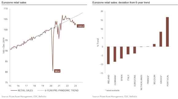 Mentre questo ulteriore grafico mostra come nel primo trimestre 2023 sia stata la Germania a guidare il calo delle vendite al dettaglio nell’Eurozona. E, soprattutto, la Bonanza dei risparmi in eccesso accumulati durante la pandemia. Da un lato, cuscinetto contro un tracollo ben più ampio rispetto al trend. Ma davvero inquietante, se messo in relazione a un quadro di stabilità creditizia come quello emerso dal dato dei prestiti. E dalla confusione sovrana attorno al caso CS-UBS.