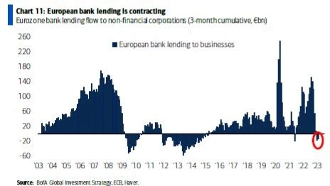 Il mercato, finora, ha finto di non vedere tutto questo. E, certamente, fra Berna e Zurigo si troverà il modo di far quadrare il cerchio. Ma creando non solo un enorme precedente, di fatto in grado di mandare in pezzi un centinaio di anni di credibilità bancaria elvetica e il profilo di trasparenza di un Paese che rimanda alla consultazione popolare anche il colore dei taxi. Bensì anche un dubbio latente che si sostanzia in quella corsa collettiva alla Discount Window della Bce. E questo secondo grafico di fatto non fa che rincarare la dose: stando a calcoli di Bank of America, il prestito bancario è già entrato in contrazione anche in Europa.