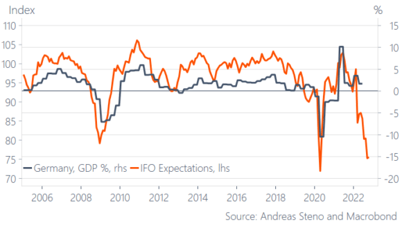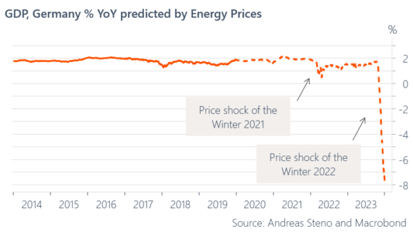 E qui si apre lo scenario più complesso, rischioso e di difficile decodifica. Perché ciò che davvero conta oggi è quanto riportato da questi due grafici, ovvero lo sprofondo totale atteso per il Pil tedesco, sia in base alle proiezioni IFO, sia – soprattutto – in base alla previsione ponderata ai prezzi dell’energia.