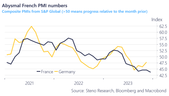 Ad esempio, sempre venerdì ha fatto scalpore il -54% patito dal fondo di Pierre Andurand con le sue scommesse sul petrolio. Certo, ormai vive e opera a Londra. Ma è pur sempre una delle star più luminose della nouvelle vague di speculatori formatisi all’ombra della Torre Eiffel. Proprio un brutto periodo. E che dire di François Villeroy de Galhau, elegantissimo Governatore della Banque de France? Sempre venerdì e di buon mattino, ha sentenziato che l’Europa sarà risparmiata dalla recessione. E con essa, la Francia. Una bella iniezione di ottimismo. Peccato che mezz’ora dopo siano stati pubblicati i dati PMI transalpini, di cui questo ultimo grafico offre lo scorcio maggiormente prospettico. Manifatturiero 42.0 da 42.9 e contro previsioni di 43.3, servizi 44.3 da 45.4 e contro previsioni di 46.0 e composite a 43.7 da 44.6 e contro attese di 45.0.