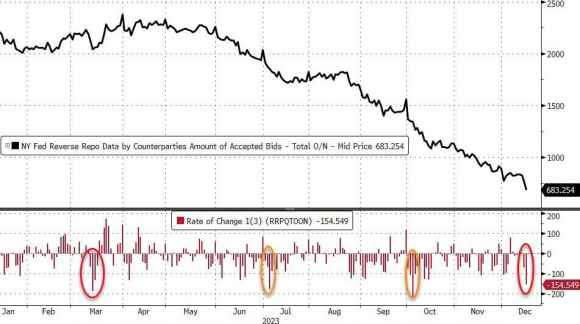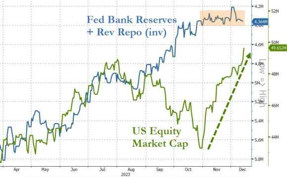 Tradotto, le riserve della Fed esplodono. E la liquidità è tornata al livello del marzo 2022. Tutto in un battito d’ali corrisposto al mese di novembre.