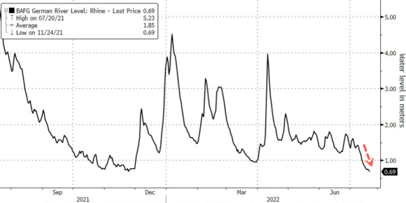 E signori, c’è un motivo. Se Nord Stream non fosse ripartito, oggi staremmo per entrare in un territorio davvero inesplorato. Un report di UBS ha infatti incorporato a livello di mercato un worst case scenario di immediato stop pressoché totale dei flussi: a detta della banca svizzera, il rischio per l’Europa si sostanzierebbe in un calo di corporate earnings del 15%, una sell-off sullo Stoxx 600 destinata a superare il 20%, un euro a 90 centesimi sul dollaro e il rendimento del Bund decennale a 0%. Signori, l’Apocalisse era (quasi) servita. E ben più grave di quella climatica dell’omonima ondata di calore che sta incendiando il Vecchio continente, da Nord a Sud. La quale, però, rischiava paradossalmente di piantare il proverbiale chiodo nella bara della recessione Ue, come mostrano queste due immagini, la prima delle quali illustra e dettaglia il corso del fiume Reno e il suo fondamentale contributo all’approvvigionamento energetico del Nord Europa, partendo dall’hub cosiddetto ARA (Amsterdam-Rotterdam-Anversa) e fino in Svizzera per un corso di 1.300 chilometri, il cui nodo strategico è in Germania nel sito di Kaub.