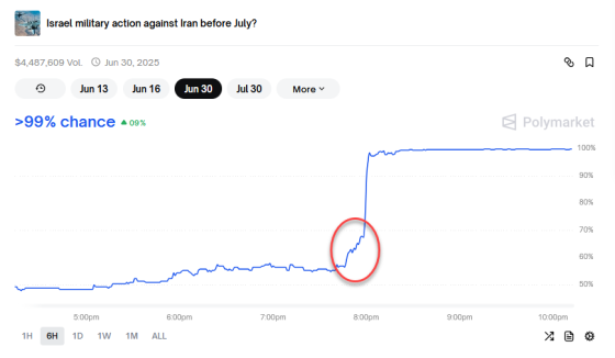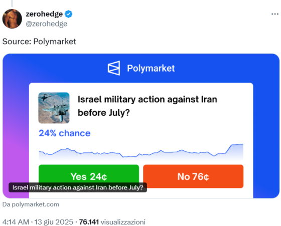 Come vedete, mentre circolava l’indiscrezione di un Israele pronto al blitz, le possibilità di un attacco entro la fine del mese su cui si poteva negoziare su PolyMarket erano date ancora al 24%. Poi, alle 20.00 ora di Washington, un uccellino sotto forma di pterodattilo deve aver fischiettato qualcosa. Boom! In tutti i sensi. E trade chiuso, stante il 100% di scommessa raggiunta nottetempo. Grazie per aver partecipato e complimenti a chi in pochi minuti è diventato ricco.