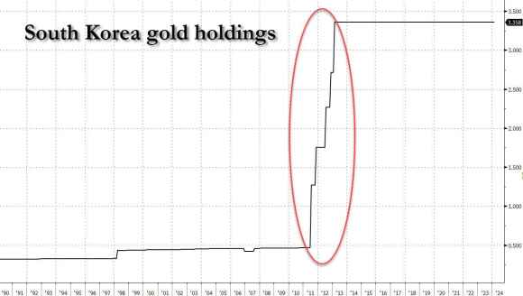 Vi lascio con un ultimo spunto di riflessione, un proxy di quelli che normalmente non finiscono sui giornali o i siti autorevoli. Guardate questo grafico, ci mostra il trend delle detenzioni di oro fisico da parte della Banca centrale sudcoreana.