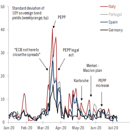 Perché la Grecia, per ovvi motivi, arriverà a raschiare il barile in tutti i modi – non ultimo, chiedendo denaro alla Cina – pur di non attivare subito il Mes: quindi, c’è il forte rischio che sia comunque Giuseppe Conte il primo ad aprire lo sportello e gettarsi dall’auto in corsa. Permettendo a tutti gli altri di rallentare, evitando il burrone e salvando la faccia. E sapete perché? Lo mostra plasticamente questo grafico: la Bce da inizio del programma Pepp ha semplicemente annullato il concetto di volatilità nel mercato dei bond sovrani. A ogni sussulto, a ogni criticità macro o di tenuta politica dell’Unione o di uno dei suoi Stati membri, Francoforte ha risposto con azioni dirette e concrete che hanno fiaccato sul nascere ogni possibile assalto speculativo. Di fatto, cancellando dal mercato il premio di rischio. Insomma, il mondo perfetto sognato dall’onorevole Borghi e dai suoi sodali: l’irresponsabilità al potere, il Festival della cicala.