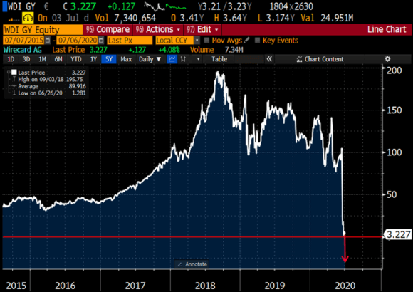 Avete notato come da qualche giorno il tracollo del gioiello fin-tech bavarese fosse finito nel dimenticatoio? Bene, ora guardate questo grafico: mostra come in base a un calcolo di Bloomberg, a sua volta frutto della sintesi del lavoro di più analisti, il price target reale del titolo di Wirecard sia addirittura -29,34 euro, stando alla somma dell’analisi valutativa delle varie parti della struttura e della deduzione dello stock di debito. Insomma, equity negativa. Un tracollo totale degli azionisti, i quali oggi stanno facendo i conti con carta che al Dax viaggia in area 2,70 euro per azione.