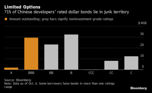 Il secondo grafico è ancora più interessante. Ci mostra come dei 107 miliardi di controvalore di debito legato a imprese di costruzioni cinesi e denominato in dollari, quello in mano agli investitori esteri, solo il 29% sia investment grade. In altre parole, il 71% di quella carta è junk. E non da oggi a causa di Evergrande e dei downgrade a catena, fin da principio. Da sempre. Ovvero, chi si è lanciato in quell’acquisto lo sapeva benissimo, conosceva i rischi. Non fosse altro, perché i rendimenti offerti – implicitamente – li confermavano. Quindi, cerchiamo di mettere la questione in prospettiva: al netto dell’atteggiamento a dir poco irresponsabile tenuto dalla Cina per un decennio abbondante di abuso di shadow banking e leva creditizia/finanziaria, davvero il cosiddetto libero mercato ora può mettere sul banco degli imputati Evergrande e le sue colleghe per quei mancati pagamenti di coupon? Davvero hanno un senso quei tardivi downgrade a livello di default selettivo, visto che parliamo per la stragrande maggioranza di aziende che emettevano ex ante debito senza investment grade e con alto profilo di rischio?