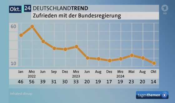 No. Lo mostra questo grafico. Stando all’ultimo sondaggio ARD DeutschlandTrend, solo il 14% dei rispondenti giudica positivamente l’azione del Governo federale. E solo quattro volte da 1997, data di inizio di tracciamento attraverso questo campionamento demoscopico, l’Esecutivo in carica aveva fatto peggio. Una volta nel giugno 2010 sotto la coalizione Cdu-Liberali (12%) e tre volte fra il 2003 e il 2004 sotto quella rosso-verde (11% e 13%). Ma cosa più importante, il 54% di chi ha partecipato al sondaggio ritiene necessario un voto anticipato, mentre il 41% pensa che la coalizione semaforo debba andare avanti fino alla naturale scadenza di mandato. Settembre 2025.