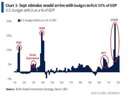 La versione Usa del Pnrr, ovviamente all’ennesima potenza. Qualcosa come il 20% del Pil statunitense, in grado di configurarsi come il più grande intervento di stimolo fiscale della storia statunitense. E in quale contesto va a inserirsi una simile iniezione di deficit? Lo mostra il secondo grafico: Pil nominale al 12% (ma in rapida decrescita), 33% di deficit e 5% di inflazione. Praticamente, benzina sul fuoco. Il tutto con 78 giornate di contrattazioni di Borsa da qui a fine anno e 3-6 settimane da assoluto redde rationem per il futuro reale dei tassi, poiché il via libera – pressoché certo – del Congresso a questa valanga di spesa pubblica sarà il driver assoluto di un lasso di tempo già di per sé costellato di appuntamenti divisivi, dal Fomc del 22 settembre al voto tedesco del 26 alla deadline posta da Nancy Pelosi per il giorno successivo (27 settembre) proprio per l’approvazione del pacchetto infrastrutturale. E poi la fine totale del bando sugli sfratti del 3 ottobre, la deadline di fine mese imposta da Janet Yellen per risolvere la ciclica questione del tetto di debito, le elezioni politiche in Giappone del 22, la riunione Bce del 28, il G20 di Roma del 30 ottobre e infine l’altro Fomc della Fed del 3 novembre. Praticamente, un tour de force in grado di sfiancare un cavallo.