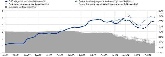 Cosa giustifica il taglio dei tassi, infatti, almeno nella versione ufficiale? Le proiezioni dei tecnici Bce, in base alle quali l’inflazione continuerà a calare in maniera sistematica, raggiungendo il target del 2% nel 2025 e da quel momento in poi destinata a rimanere spiaggiata su quei lidi di assoluta sostenibilità. Al netto delle cantonate in tal senso prese dai medesimi tecnici negli scorsi trimestri, prendiamo per buona questa proiezione. Perché allora questo grafico allegato al report ci dice che il tracciatore salariale utilizzato dalla stessa Bce prevede una dinamica che implica un tasso di inflazione doppio?