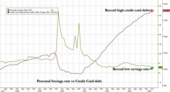 Primo, è giunto in contemporanea con un regime di tassi di interesse su carte di credito che negli Usa ha appena toccato il nuovo record del 22,76%. Praticamente, ogni volta che strisci garantisci la nuda proprietà di un tuo organo vitale. Ma nonostante questo, stante dinamiche salariali cresciute soltanto nelle statistiche manipolate del Bureau of Labor Statistics, l’americano medio deve obbligatoriamente spendere attraverso la carta di credito. Per guadagnare tempo. Non a caso, oggi il debito totale legato a quello strumento di dilazione della spesa è al massimo storico.