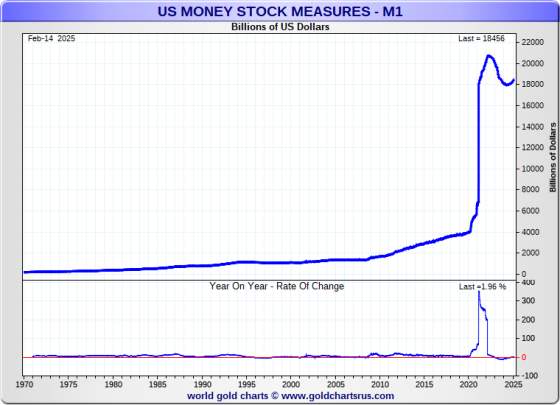 Date un’occhiata a quest’altro grafico, adesso. Ci mostra un parallelo abbastanza plastico. Quando gli Usa decisero a loro volta di cambiare composizione della massa monetaria M1, includendo i conti deposito, quest’ultima conobbe un aumento implicito, diciamo una rivalutazione, da 4,8 trilioni a 16,2 trilioni solo nel mese in corso. E quel mese era maggio. E l’anno 2020. Ovvero, piena pandemia.