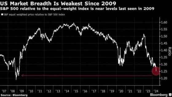 Ad esempio, la svendita di pesos messicani dopo l’elezione della prima donna chiamata a guidare il Paese non va letta come atto di sfiducia. Ipotesi quest’ultima tutt’altro che peregrina, non fosse altro perché la campagna elettorale si è basata su una selezione darwiniana a cura dei cartelli della droga che hanno ammazzato una trentina di pretendenti. No, si svendevano pesos utilizzando la scusa del voto per acquistare yen e sostenere la Bank of Japan. La quale dopo aver speso inutilmente 62 miliardi di dollari per sostenere la sua valuta il mese scorso, era ormai pronta a mettere mano alle detenzioni di Treasuries Usa. Proprio mentre il Tesoro opera buyback di quella carta ormai non più negoziabile per toglierla dai bilanci delle banche regionali. Non sia mai, i carry trades servono a questo ormai, nulla più che uno strumento alternativo nella cassetta degli attrezzi del Qe perenne. Spingendo l’euro al ribasso con la sua decisione, la Bce direziona i capitali verso il mercato Usa. E questo grafico ci mostra il perché: la cosiddetta “ampiezza del mercato” (breadth) delle equities Usa – ovvero, il numero totale di azioni di un determinato indice che stanno aumentando di prezzo rispetto a quelle che invece stanno patendo cali – è ai minimi dal 2009. Tradotto, Wall Street sta in piedi per Nvidia e per auto-convincimento da short squeeze. Nulla più.