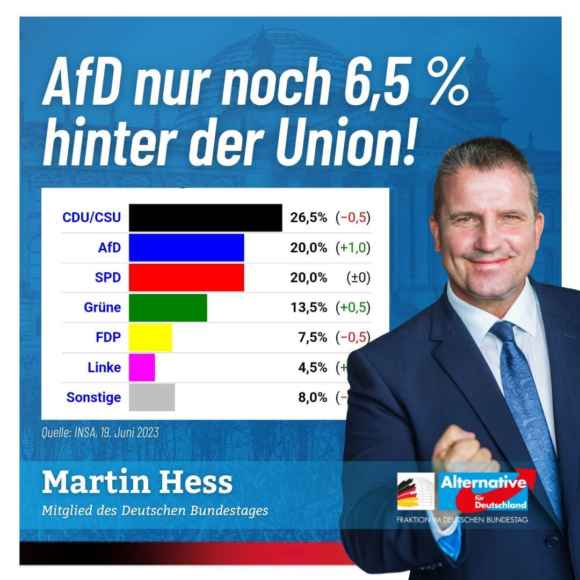 E perché questo ci riguarda direttamente, mentre lo scontro sul Mes pare assumere toni sempre più da conto alla rovescia non solo con l’Europa, ma anche all’interno dello stesso Governo? Primo, il Nord Italia è dipendente in maniera sostanziale dal ruolo di subfornitura e fabbricazione macchinari per l’industria e la manifattura teutonica. Tradotto, il tonfo attuale arriverà come uno tsunami a fine estate sugli ordinativi. In piena contrazione del credito. E con l’Emilia-Romagna azzoppata, quindi con una voce del Pil che verrà a mancare nel suo ruolo di traino. Secondo, ce lo mostra questa immagine finale: stando a un sondaggio Insa a livello nazionale e pubblicato due giorni fa, Alternative fur Deutschland è oggi seconda forza politica del Paese alla pari con l’Spd del Cancelliere in carica. E a soli 6,5 punti percentuali dall’Unione democratico-cristiana.