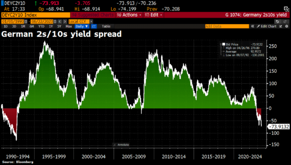 In compenso, questo secondo grafico ci riguarda. Molto. Più che il PMI manifatturiero pubblicato oggi, dovrebbe preoccuparci quanto accaduto ieri: inversione sulla curva 2-10 anni del Bund a -94 punti base, il massimo dal 1992. Altro annus horribilis, quantomeno per la Germania.
