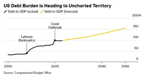 Ora date un’occhiata a quest’altro grafico, fresco di pubblicazione all’interno del dossier di proiezione sui conti pubblici Usa del Congressional Budget Office. La ratio debito/Pil statunitense toccherà quota 100% entro l’anno prossimo e sfonderà 150% entro i prossimi 25 anni, stante i trend attuali. I quali parlano di 1 trilione di debito in più ogni 100 giorni. E spese per soli interessi annuali che hanno superato la linea Maginot del trilione di dollari.
