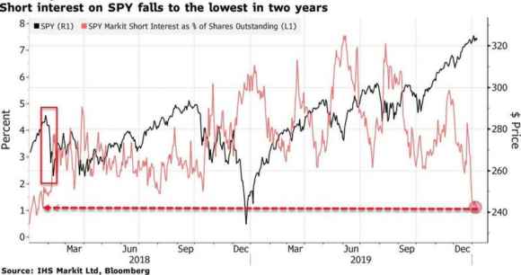Guardate questo altro grafico, il quale ci mostra un effetto collaterale del rally azionario di fine anno innescato proprio dal ritorno all’interventismo diretto della Federal Reserve: le posizioni shorts sullo Standard&Poor’s 500 sono ai minimi da due anni. Nessuno più si azzarda a scommettere al ribasso su questo mercato, nessuno è in modalità copertura dal rischio: sapete cosa significa questo, in caso qualcosa dovesse andare fuori controllo e far partire una reazione sull’esposizione alla catena di controparte? Che l’intero mercato – o quasi – sarebbe colto con la proverbiale guardia abbassata e i tempi di reazione sulle posizioni aperte, a quel punto, sarebbero molto più lenti del precipitare delle vendite e delle chiusure forzate di contratti.