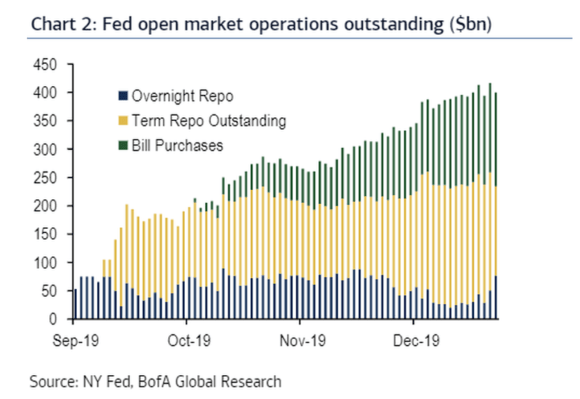 Contempla tutto: aste term, repo e acquisti di T-bills in seno al nuovo Qe partito a metà ottobre. Pensavate davvero che questa massa di liquidità ormai strutturale potesse essere ritirata dal mercato così in fretta? Credevate davvero al carattere temporaneo di quelle operazioni di finanziamento? Sicuramente no. E facevate bene. Anche perché, di fatto, è lo stesso Clarida con le sue argomentazioni risibili a rendere il quadro degno di un film di Mel Brooks: scusate, se l’economia americana è in forma smagliante come sostiene il vice-presidente della Fed, perché il sistema finanziario che ne opera da dinamo ha mediamente bisogno di 70-90 miliardi di liquidità al giorno? E, più in generale, ha avuto bisogno solo a ridosso dell’arco temporale fra inizio dicembre e inizio gennaio di qualcosa come 414 miliardi di liquidità iniettata per evitare contraccolpi sul mercato interbancario overnight come quelli di metà settembre (o peggio)?