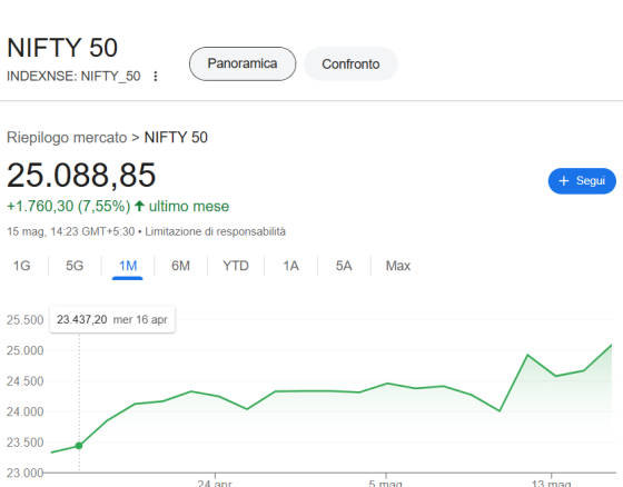 Vi pare un andamento che prezza il rischio di un potenziale conflitto atomico, visto che entrambe le nazioni sono dotate di armamento nucleare? A me sembra un indice in stand-by di qualcosa. Ora schiacciamo il tasto fast forward e arriviamo a oggi. Per l’esattezza, al 13 maggio. Cessate il fuoco proclamato e grande sospiro di sollievo collettivo. Donald Trump rivendica e gongola. La stampa ciclostila ricostruzioni esclusive. Quel giorno il Nifty50 perse l’1,39%. Perché?