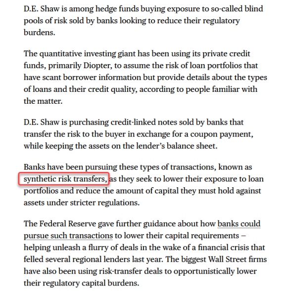 Forse, Weiss Multi-Strategy ha pensato che un mondo in cui gli hedge funds diventano riciclatori di assets bancari, alla fine di circonvenire la regolamentazione sui requisiti di riserva e capitale (di fatto, poco più che prestanomi), potrebbe non conoscere un epilogo particolarmente edificante. Il giochino è semplice: stante l’impossibilità di fare totalmente fesse Fed e Sec, le banche si sono inventate il synthetic risk transfer. Ovvero, scaricano il rischio contenuto in portfolios a dir poco dadaisti verso fondi speculativi, cui pagano in cambio un coupon. Mantenendo l’asset a bilancio. Ovviamente, sotto la voce di unrealized loss. O nei Level 3. E la Fed non interviene. E la Sec neppure. Si limitano a osservare. Anzi, persino a fornire la guidance per farsi fare fesse! Di fatto, inviando al mercato delle varie SMCI e Nvidia un messaggio implicito: tranquilli, bail-out garantito per tutti. Giocate pure. Altrimenti, salta il Sistema.