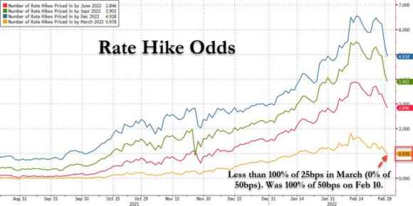 Il GDPNow della Fed di Atlanta parla chiaro: nella rilevazione del 1 marzo scorso, il Pil statunitense del primo trimestre tracciato in tempo reale segna 0%. A fronte di un’inflazione al massimo dal 1982. Conseguenza? Ovvia anche per uno studente di economia al primo anno: appunto, stagflazione. E all’ennesima potenza, appunto. Perché con il petrolio sopra 110 dollari al barile e un regime sanzionatorio che metterà volontariamente e ulteriormente il turbo al nuovo super-ciclo delle commodities già in atto, i mesi a venire saranno ben peggiori di quelli del 1973. La grande austerity, la prima crisi energetica che fece andare gli italiani in bicicletta. E con una prospettiva ancor più grave rappresentata dalla seconda immagine: i venti di guerra stanno polverizzando a tempo di record le aspettative globali di rialzo dei tassi (basti vedere l’andamento da gambero del nostro spread) e, anzi, i futures sull’euro-dollaro già prezzano un primo taglio nel 2023. Forse già nel dicembre di quest’anno.