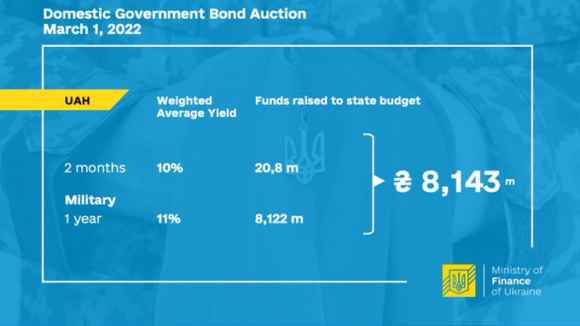 Volete un bell’esempio dell’ipocrisia di fondo che sta caratterizzando il financial warfare scatenatosi con le sanzioni di Ue e Usa contro la Russia? Guardate questa immagine, la quale mostra il risultato dell’emissione del primo bond di guerra da parte di Kiev, tenutasi il 1 marzo scorso. Storicamente, i war bonds sono strumenti di indebitamento sul mercato che servono appunto a sostenere lo sforzo bellico, ovvero l’acquisto di armi, le spese di difesa, ma anche quelle per garantire sollievo all’economia interna del Paese belligerante emittente.