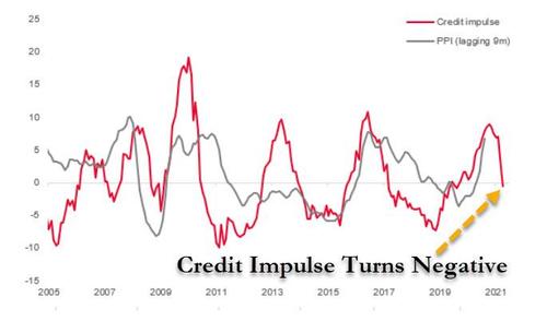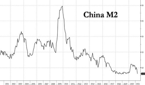 Ma attenzione, perché mentre la Fed continua a definire transitoria l’inflazione e prosegue con la sua politica di alluvione del mercato, tanto da essere costretta a incamerare reverse repo a colpi di centinaia di miliardi ogni notte da parte di decine di bidders, questi due grafici ci mostrano come la Cina abbia davvero dato vita a una sua versione di tapering delle misure eccezionali messe in campo contro la pandemia. E ci devono far riflettere, perché non solo l’impulso creditizio ha appena virato in negativo, impiegando sette mesi di ciclo dal suo massimo contro i 9-10 storicamente registrati, ma il tasso di crescita annuale della massa monetaria M2 del Dragone è appena crollato all’8,1%, ben al di sotto del 9,2% atteso dagli analisti e poco al di sopra del minimo storico record dell’8,0%.