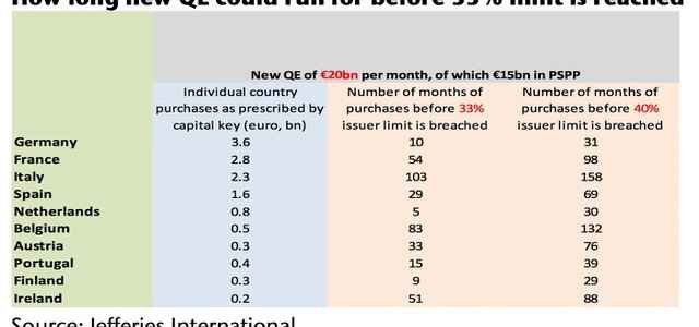 SuperMario aveva appena fatto l’ultimo, enorme regalo all’Italia, comprandole altri mesi di tregua dallo spread. Perché i numeri, a differenza delle chiacchiere, non sono soggetti a interpretazione: in base al controvalore di 20 miliardi al mese di acquisti annunciato dalla Bce e al criterio di capital key sulle emissioni pro quota per i vari Paesi (non modificato nell’ultimo board), il nuovo ciclo di Qe formalmente garantisce al nostro Paese e al suo debito mesi e mesi di schermatura, grazie agli acquisti da parte di Francoforte. I Bund, invece, solo 10 mesi di acquisti eligibili in base alla norma del 33%. Finiti i quali, il board che all’epoca sarà guidato da Christine Lagarde dovrà riunirsi per decidere cosa fare: alzare quel 33% al 40%, come ipotizzato da Jefferies nei suoi calcoli?